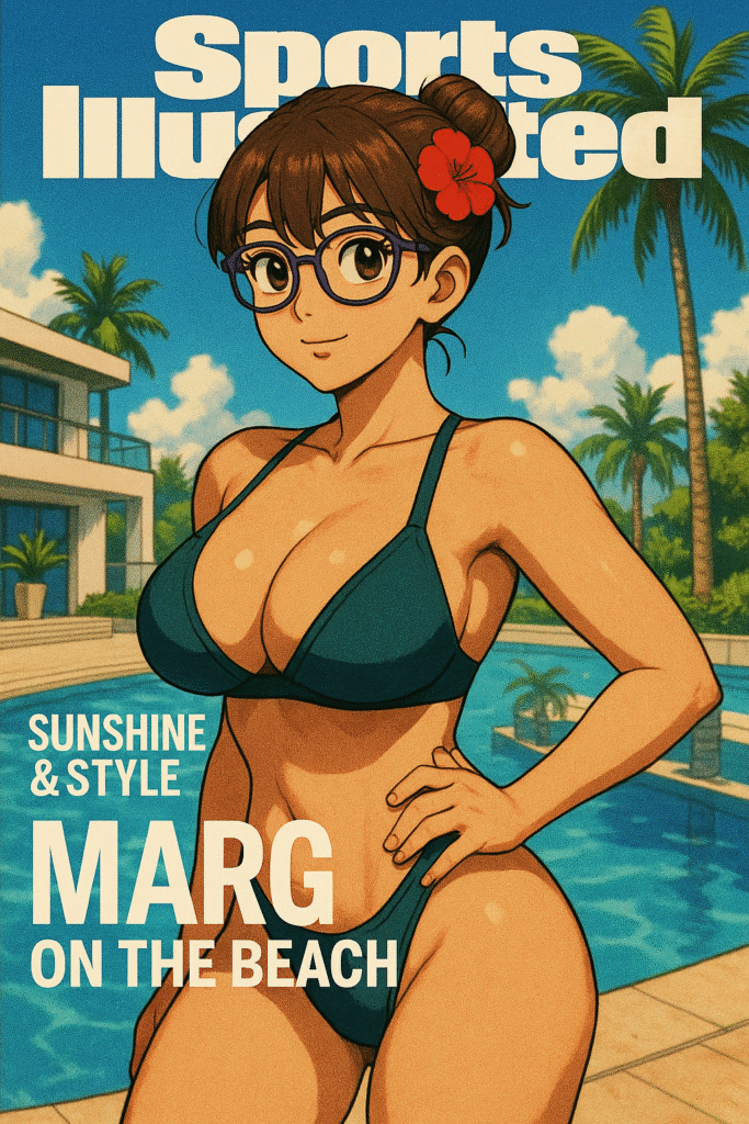 L’idée était claire : donner à Marg une esthétique de magazine culte, entre Sports Illustrated et revues surnaturelles japonaises. Le style shōnen apporte l’énergie et la sensualité, tout en gardant ce grain rétro granuleux qui colle parfaitement à son identité visuelle.