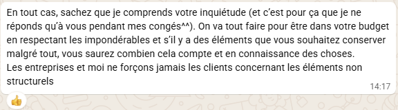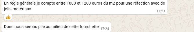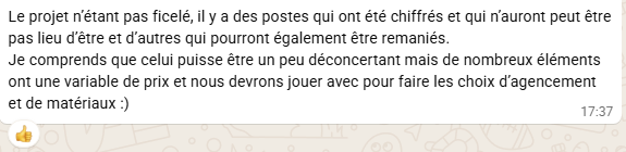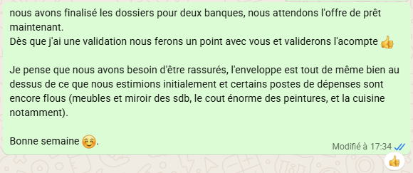 En tout cas notre archi ne se sentait pas plus concernée que cela, le dernier devis reçu, le vendredi, elle nous le transmettra sans l’ouvrir avant de partir en vacances deux semaines à Miami… Le lundi de son retour, nous signions chez le notaire sans avoir pu lui parler sérieusement. Avec pour seul ligne de vie un message WhatsApp qui nous disait que ça ira.